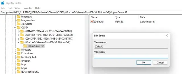 5. Ora spostati nella cartella “InprocServer32″ e fai doppio clic su ” Predefinito ” nel riquadro di destra. Successivamente, fare clic su “OK” senza modificare alcun valore.