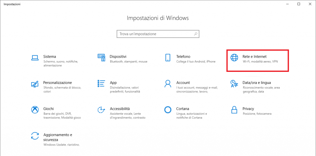 Successivamente apriamo Rete ed internet dalle impostazioni di Windows